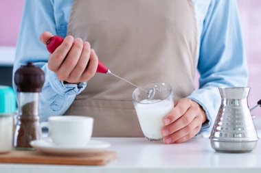 Sólo debes verter la leche en un recipiente o en el espumador, si es de sobremesa, y batirla hasta que espume y conseguir así una textura cremosa que le da otra dimensión a tus bebidas calientes.
